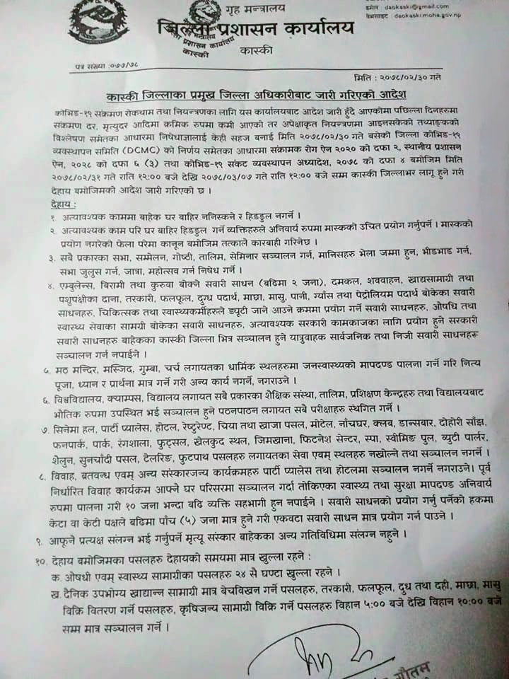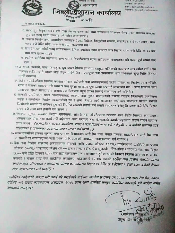 जिल्ला प्रशासन कार्यालय कास्कीका अनुसार निषेधाज्ञामा यस अघिको समयमा १ घण्टा थप गरी अत्यावश्यक खाद्य सामग्री खरिद बिक्रीका लागि बिहान ५ बजे देखि १० बजेसम्म खुला रहने भएको छ । उक्त समयमा अत्यावश्यक खाद्य सामग्रीका पसल, व्यवसाय र डिपार्टमेन्टल स्टोर्स (खाद्य सामग्री मात्र विक्री गर्न) खुला हुने छन भने खाद्यान्न, तरकारी, पानी, फलफूल, दुध जस्ता देनिक उपभोग्य वस्तु नजिकको पसलबाट मात्र खरिद गर्ने तर सोको लागि सवारीसाधन प्रयोग गर्न पाइने छैन । फलफूल तथा तरकारीको थोक बिक्रेताले खुद्रा बिक्री वितरण गर्न पाउने छैनन् ।