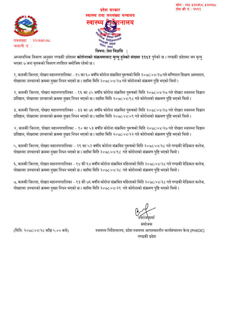 पोखरा न्यूज । पछिल्लाे २४ घण्टामा पोखरा महानगरपालिकाका थप ७ जनाको कोरोना संक्रमणका कारण अस्पतालमा उपचारको क्रममा मृत्यु भएको गण्डकी प्रदेश स्वास्थ्य निर्देशनालय पोखराले बिहीबार पुष्टि गरेको छ ।