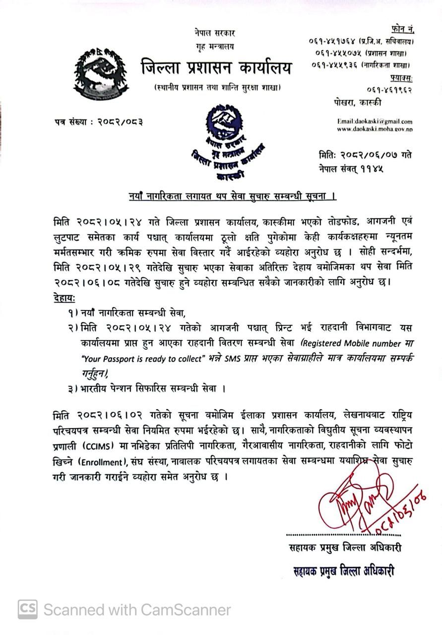 पोखरा । जिल्ला प्रशासन कार्यालय कास्कीबाट नयाँ नागरिकतासहितका थप सेवा संचालन हुने भएको छ ।